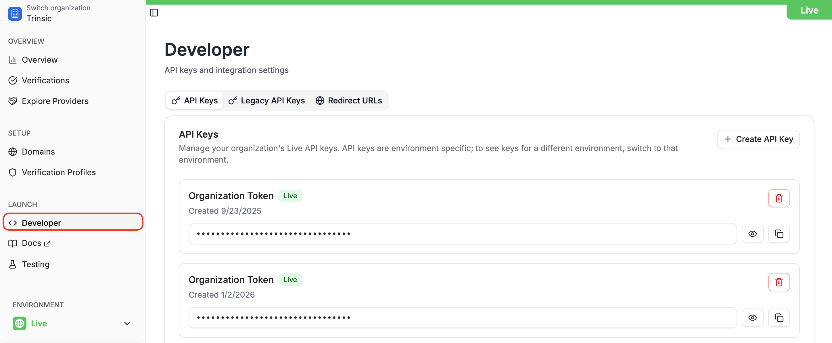 Most teams start in Test, then move to Live once they’re ready to demo real providers or go live in production. You can create multiple verification profiles in Live to separate demo and production use cases.