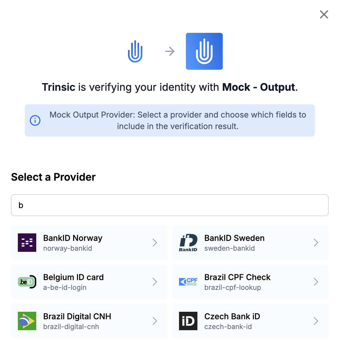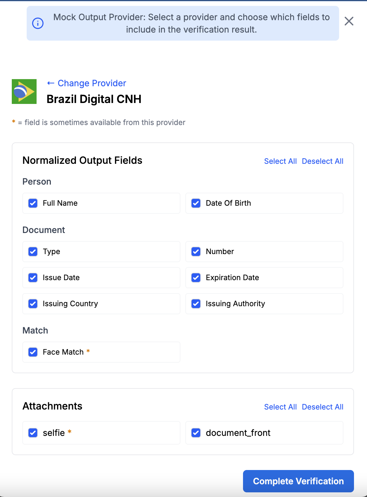When you launch a verification with the Mock Output provider, you can select any provider.